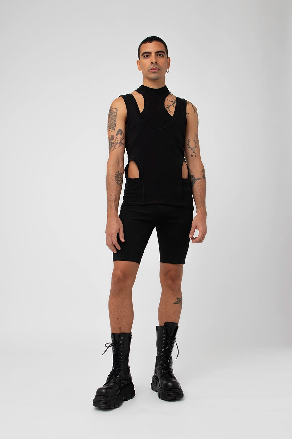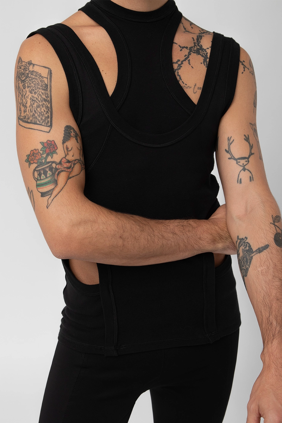 Double ribbed tank top. Finished with decorative cover stitch seams. This garment is made with in-stock organic cotton. Slim fit, regular length, sleeveless.