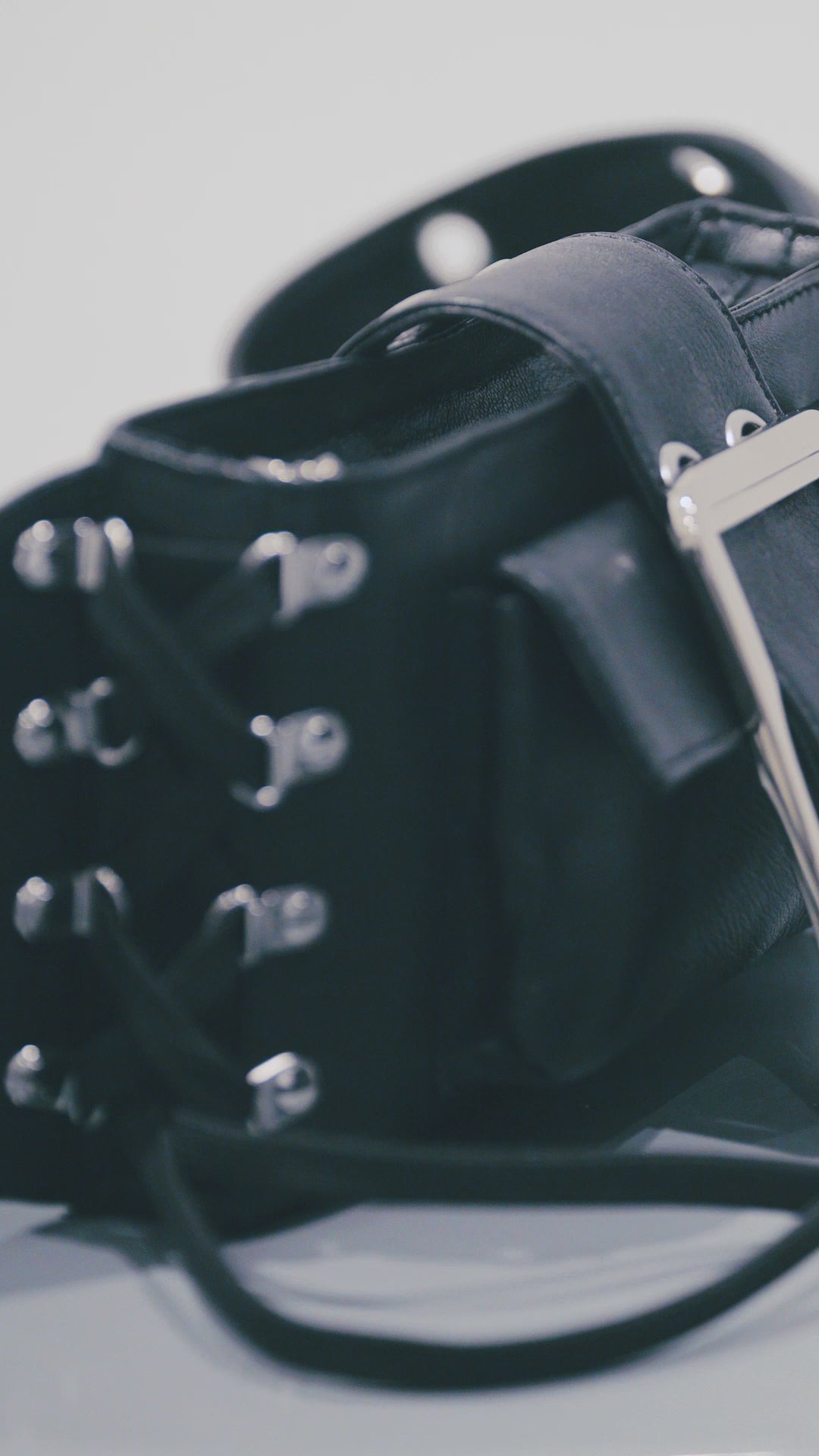 Adjustable crossbody strap with branded buckle and double eyelets.